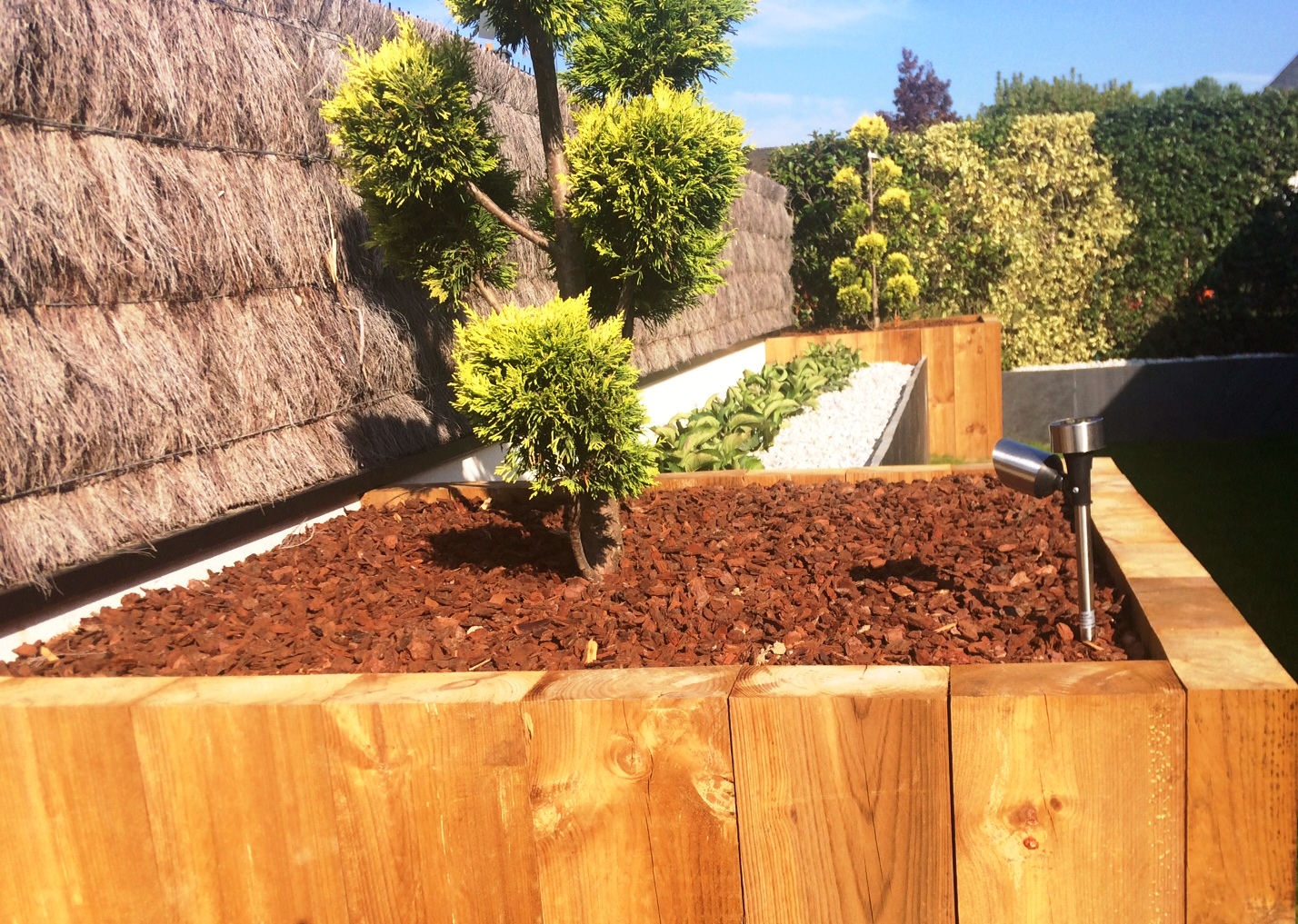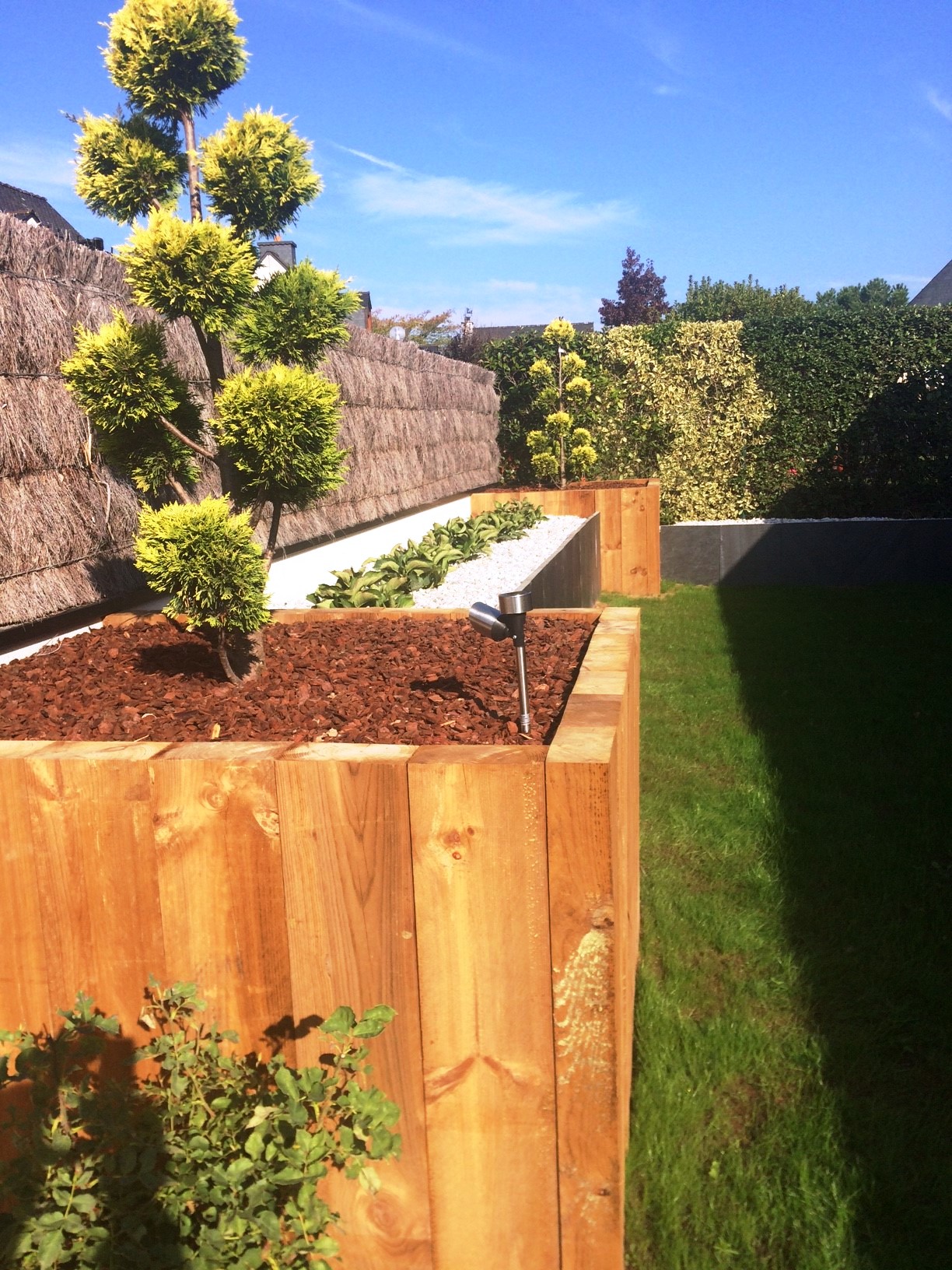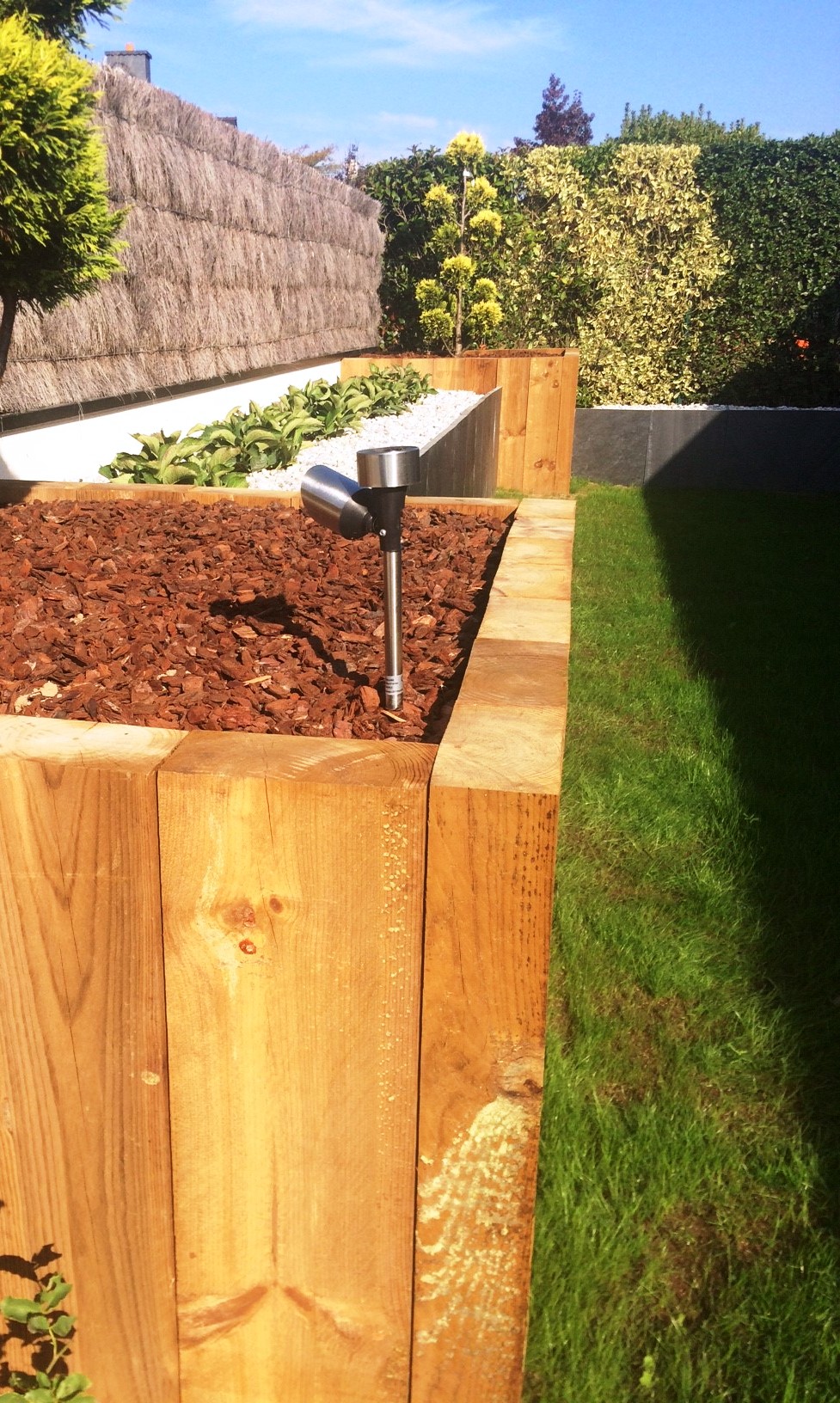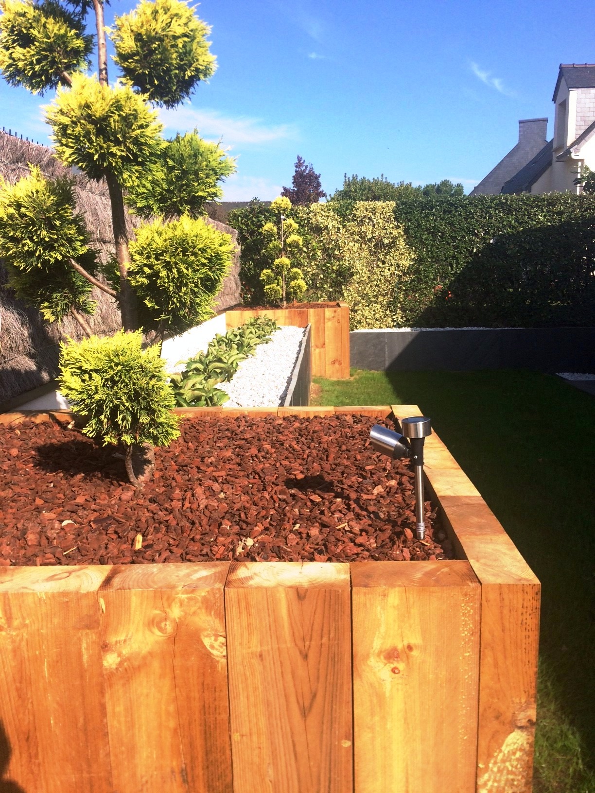 Des jardinieres en traverses paysagères et palis ardoises permettent le soutènement et la remise à niveau du terrain.